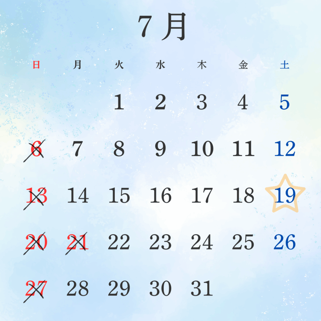《 7月の休業日 》 7月6日(日) 7月13日(日) 7月20日(日) 7月21日(月)海の日 7月27日(日) ※事前予約、緊急時は対応可能です。