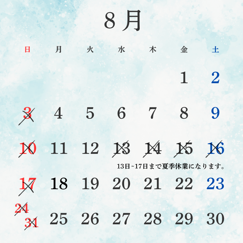 《 8月の休業日 》 8月3日(日) 8月10日(日) 8月13日(水)夏季休業 8月14日(木)夏季休業 8月15日(金)夏季休業 8月16日(土)夏季休業 8月17日(日)夏季休業 8月24日(日) 8月31日(日) ※事前予約、緊急時は対応可能です。